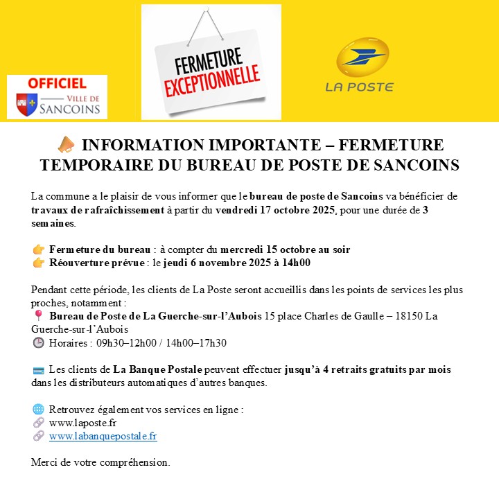 FERMETURE TEMPORAIRE DE LA POSTE DE SANCOINS